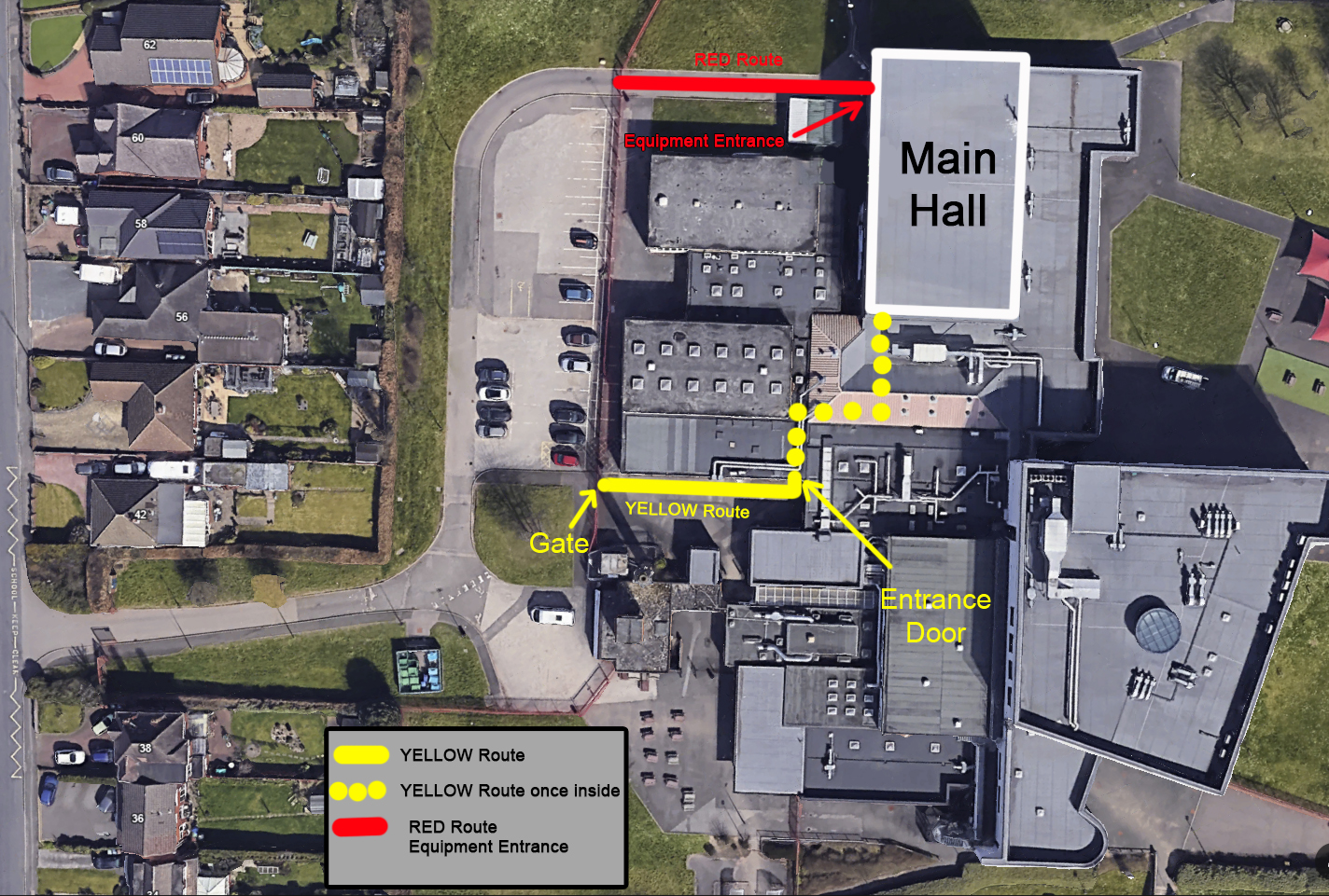 Due to the inclement weather of recent weeks, the school have asked us to use the entrance gate towards the opposite end of the car park (Yellow route), Please look at the graphic below showing the entrance (We know some of you already use this entrance to leave at the end of the evening). Once the track equipment is in the hall the usual top entrance will be shut and you will NOT be able to enter at this point (Red Route).